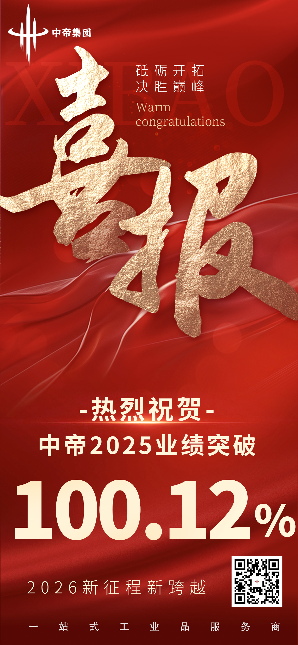 砥砺开拓,决胜巅峰!热烈祝贺中帝集团2025年业绩突破100.12%,超额完成年度目标!作为一站式工业品服务商,中帝始终以专业与坚守深耕行业,这份成绩离不开每一位伙伴的并肩前行。2026年,我们将以新征程为起点,持续突破创新,携手客户与合作伙伴迈向更高跨越!