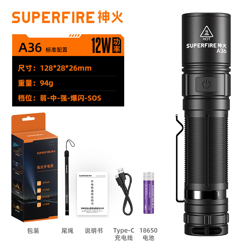 【神火】神火强光手电筒A36便携小巧带腰夹磁吸迷你EDC户外探险手电筒跨境