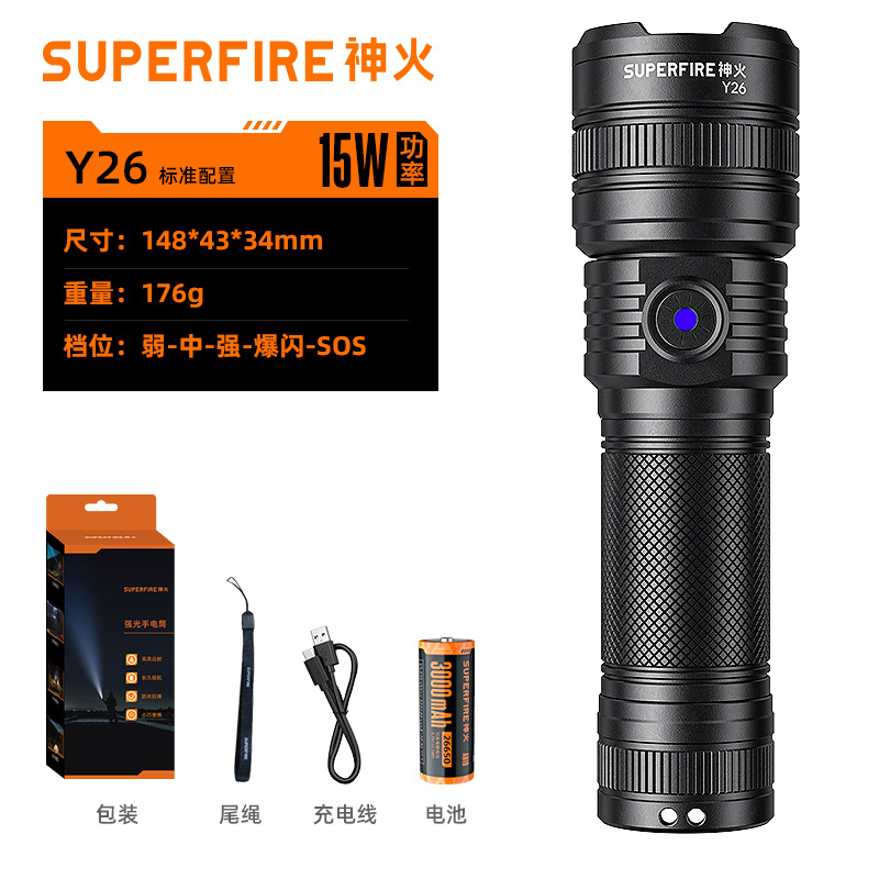 【神火】神火Y26手电筒强光充电户外超亮变焦防水铝合金防身usb远射照明灯