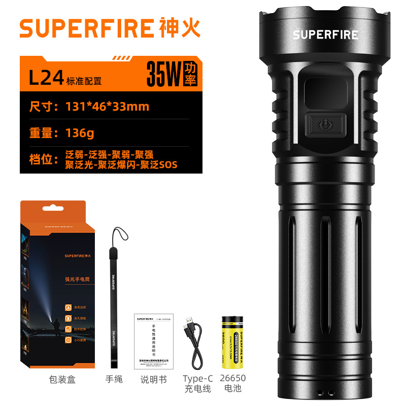 【神火】神火M5强光手电筒36W充电大功率高亮远射户外应急照明电筒