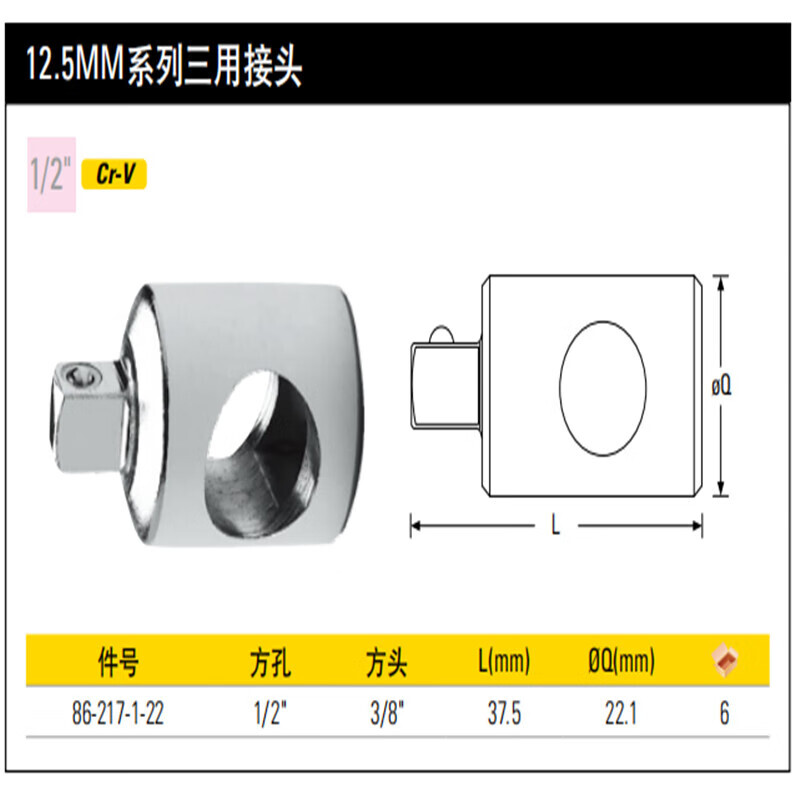 | 产品名称 | 12.5MM系列三用接头(1/2"孔3/8"头) |