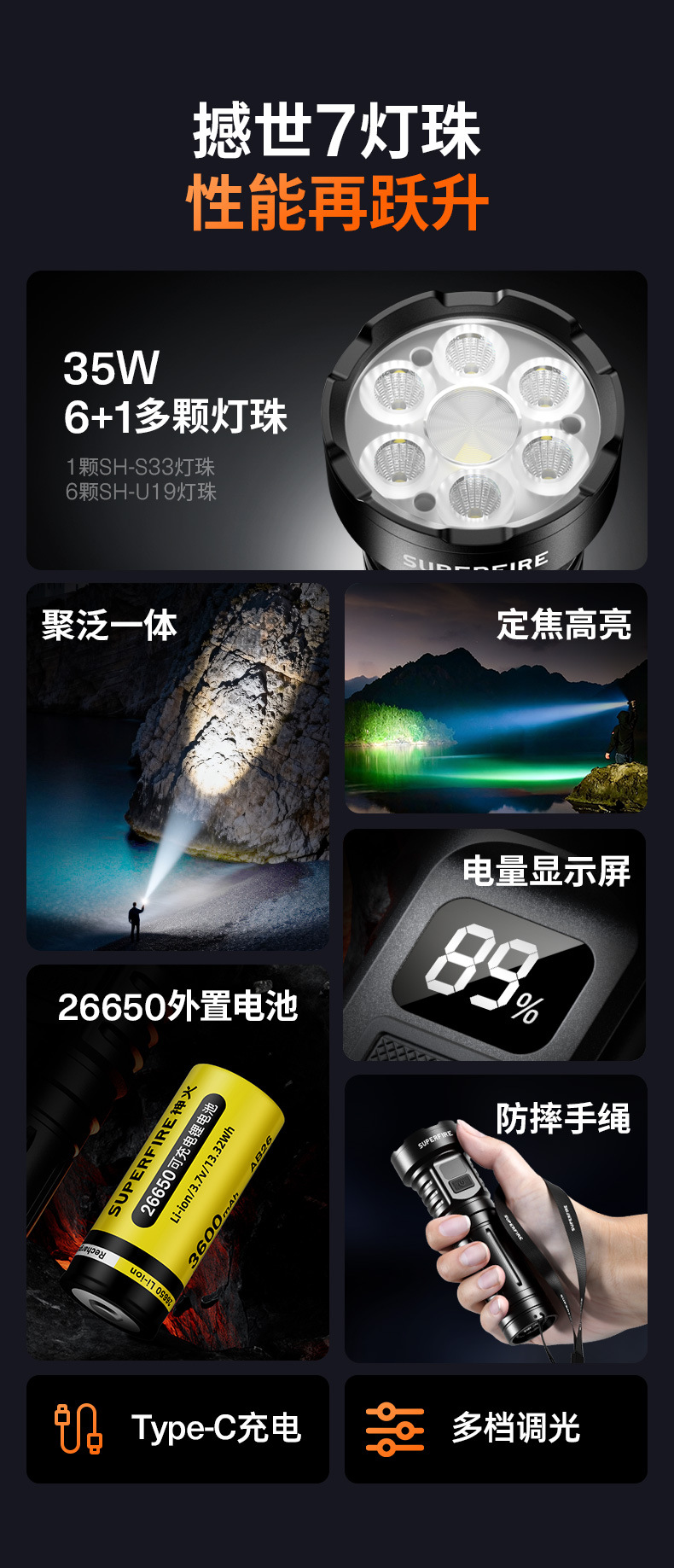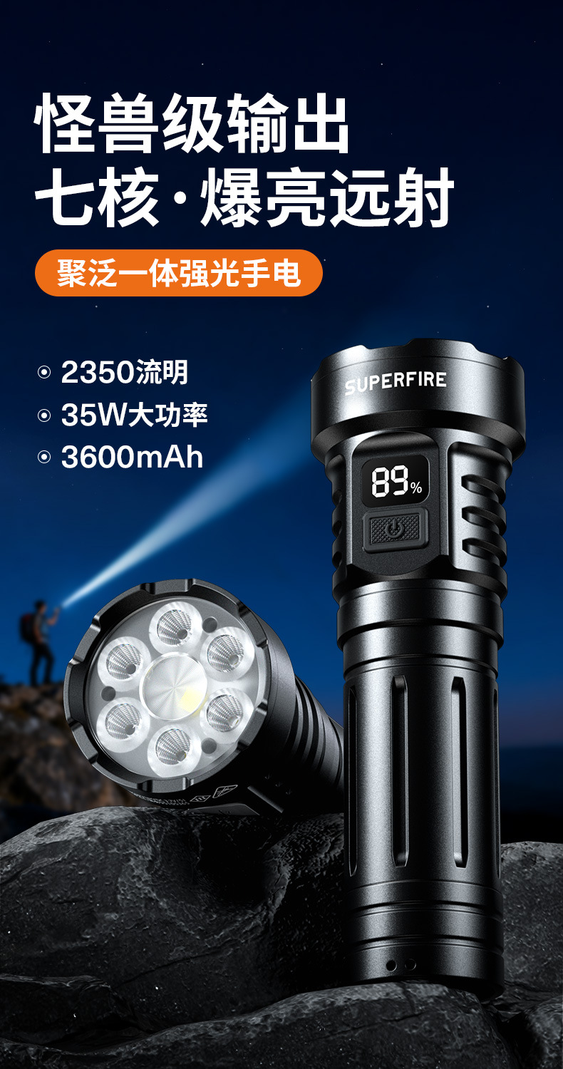 | 产品名称 | 神火大功率强光手电户外防水铝合金多功能高流明LED屏显应急手电 |