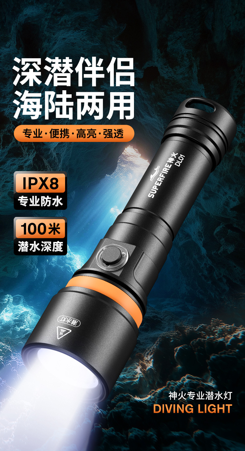 | 产品名称 | 神火新款专业潜水手电筒强光LED水陆两用IP68水下照明长续航手电 |