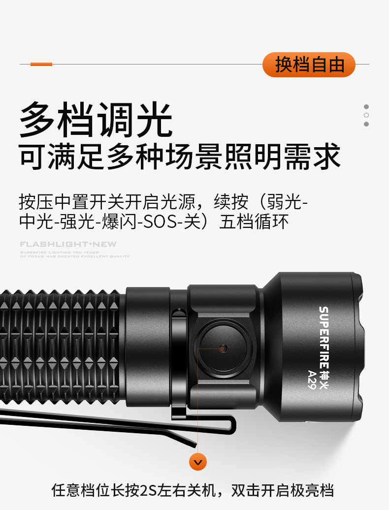 | 产品名称 | 神火A29强光手电筒EDC便携小巧带腰夹磁吸迷你户外巡逻定焦手电筒 |