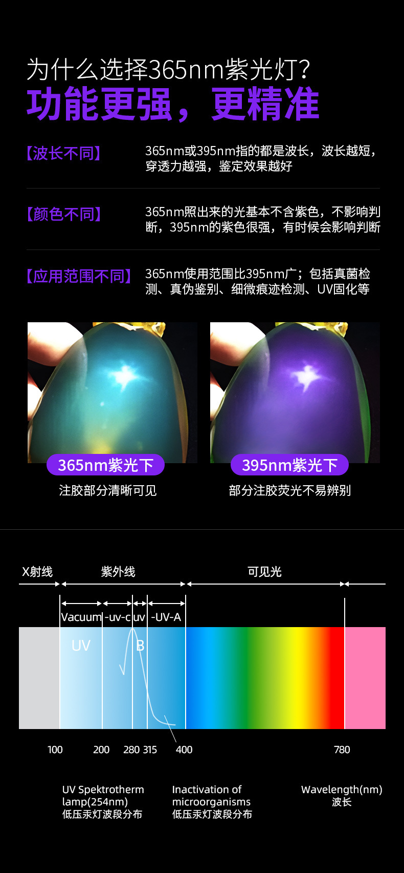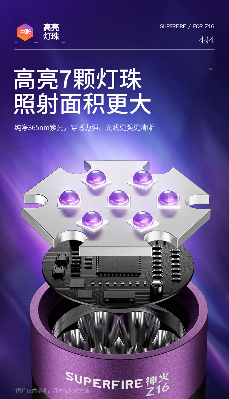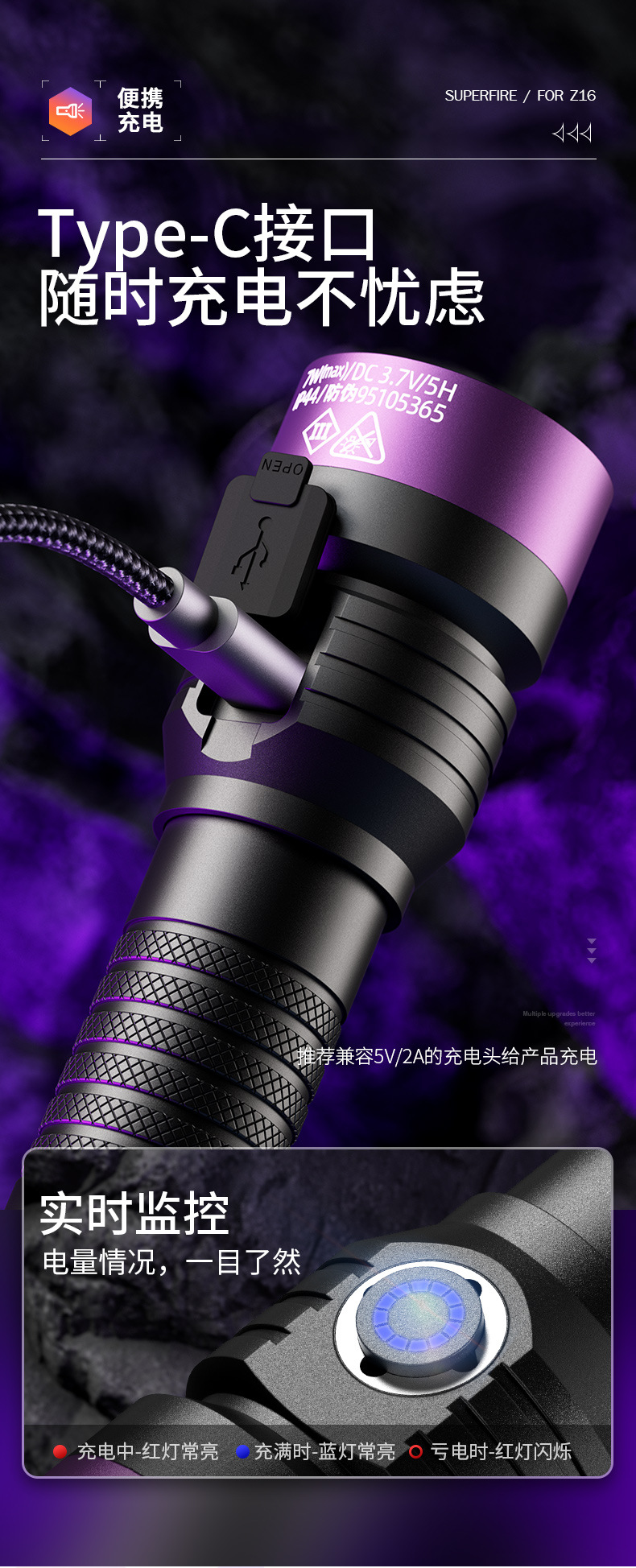 制造商型号:Z07(续航约3h+功率3W)395nm紫光手电筒