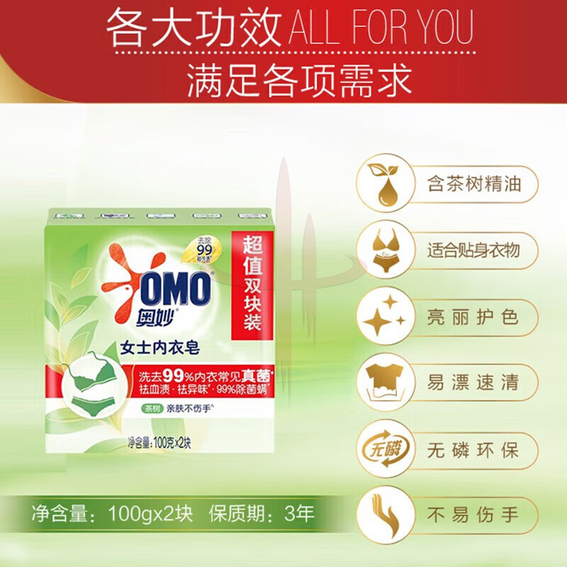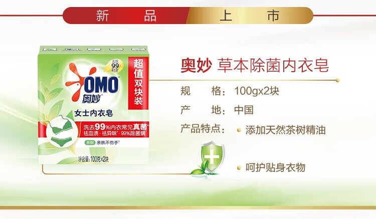 | 产品名称 | 奥妙内衣皂内衣裤祛异味草本99%除菌洗衣皂肥皂贴身衣物100g*2块 |