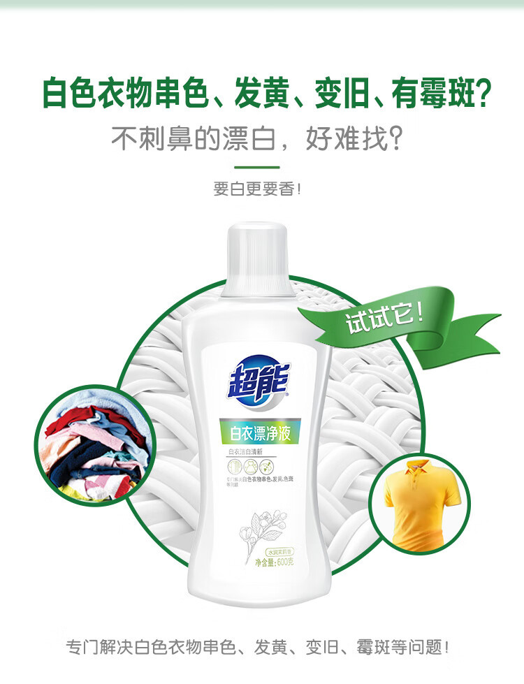 | 产品名称 | 超能白衣漂白液彩衣彩漂液去黄去渍增白留香去污增白剂家用漂白剂 |