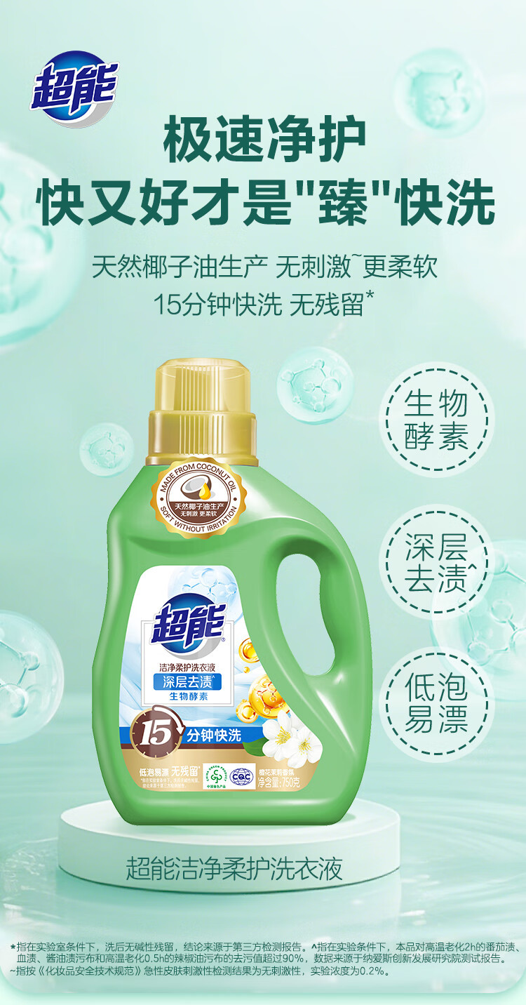 | 产品名称 | 超能洗衣液洁净柔护持久留香深层洁净自然清香去污渍家庭实惠装 |