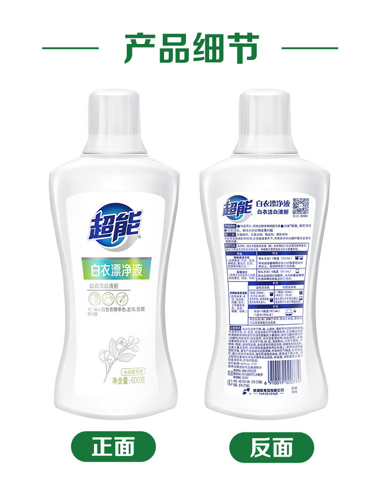 | 产品名称 | 超能白衣漂净液600g白色衣物护衣护色不伤衣去渍去黄白漂不刺鼻 |
