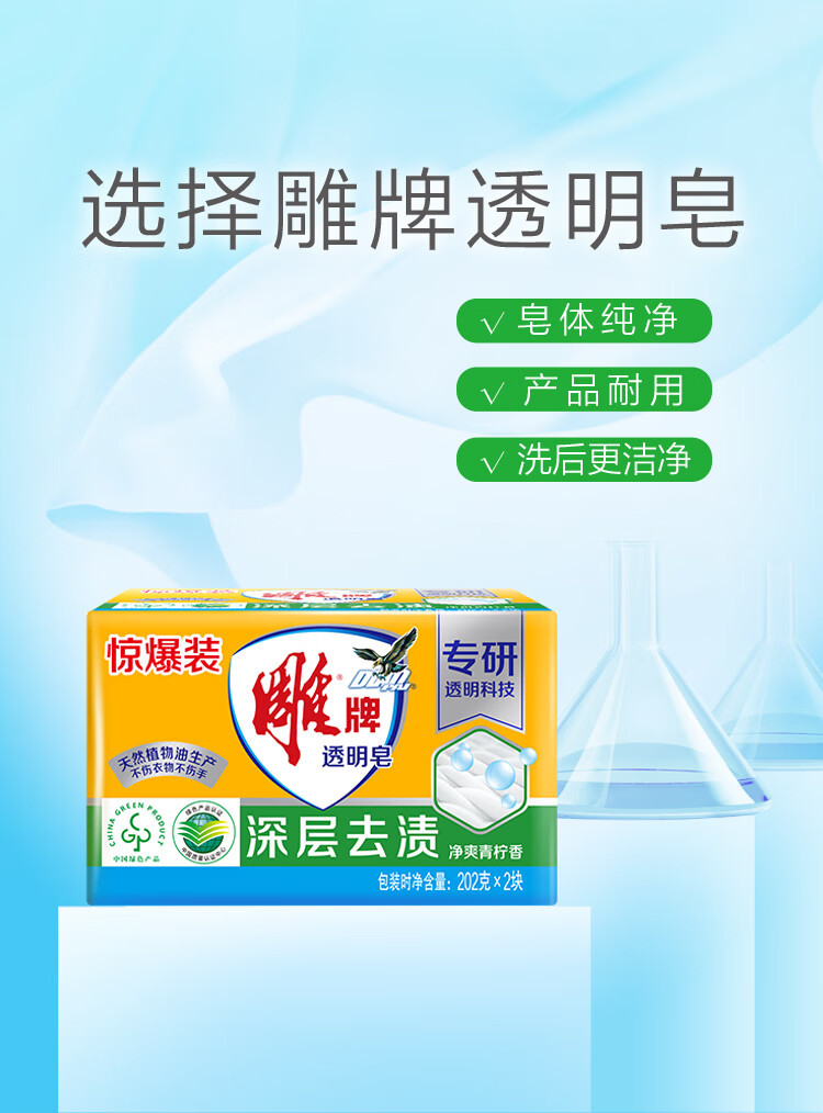 | 产品名称 | 雕牌肥皂透明皂202g*2块批发洗衣皂深层去渍温和不伤手实惠家庭装 |