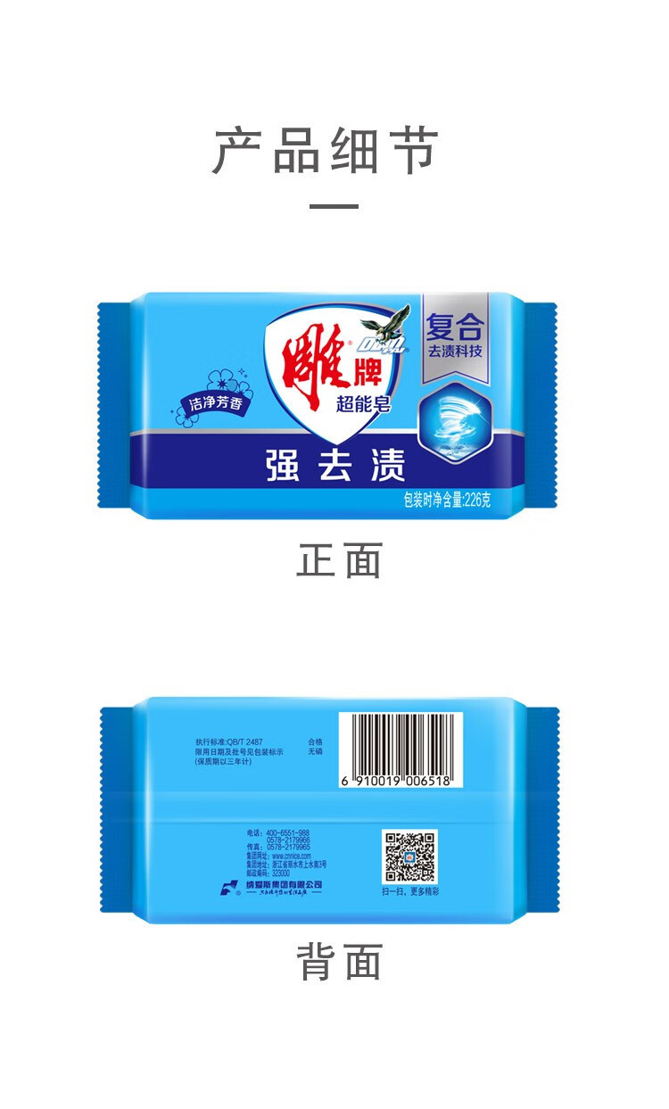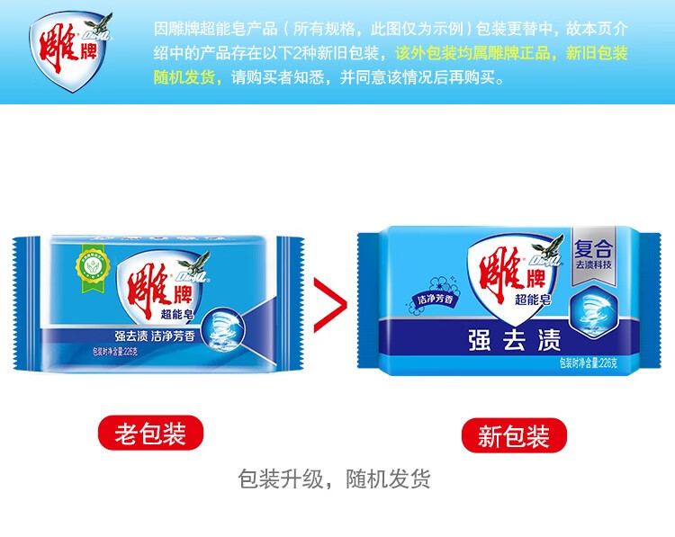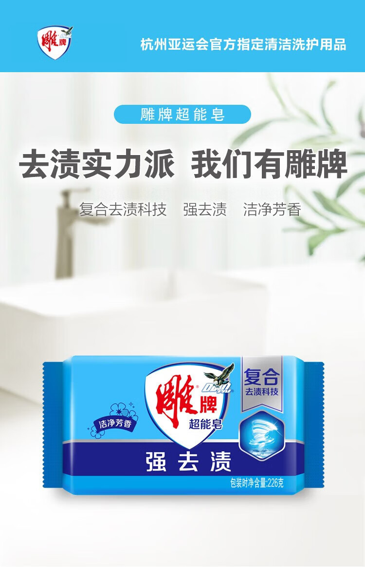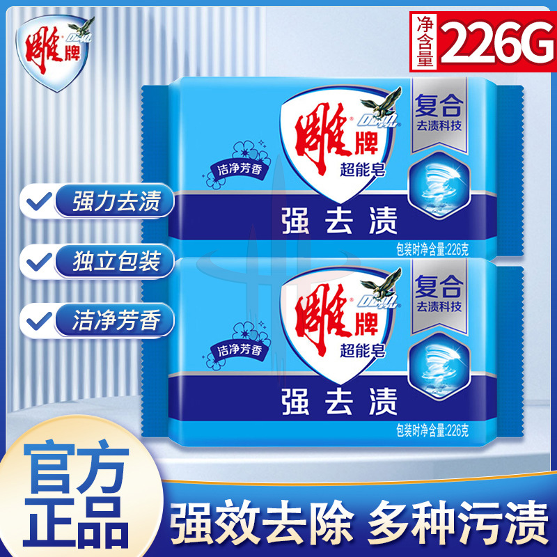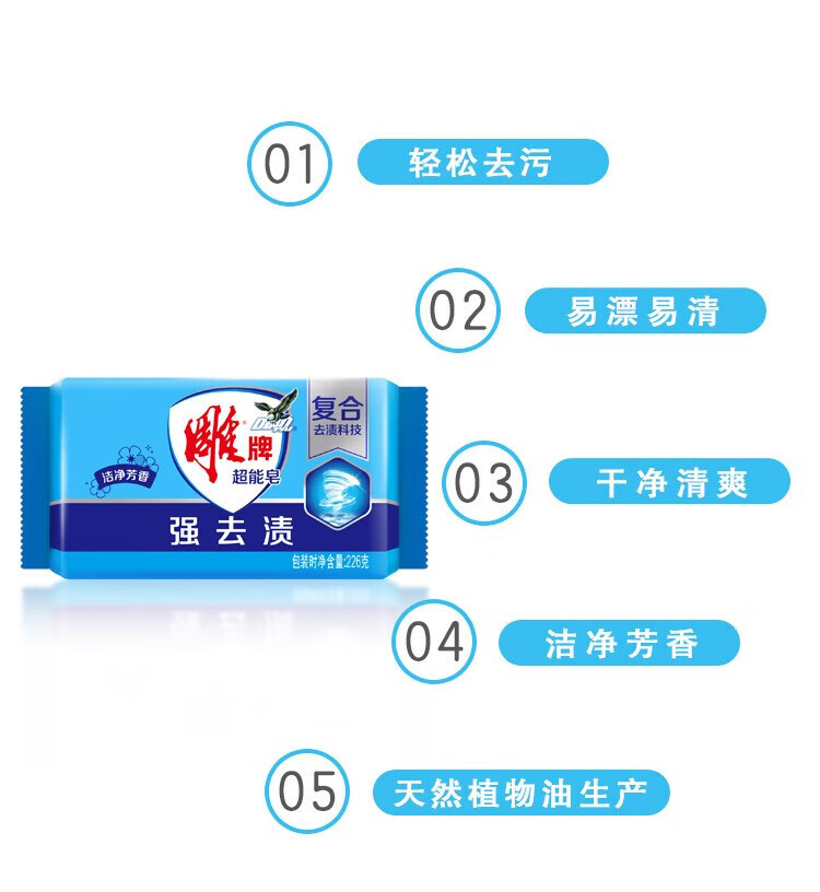| 产品名称 | 雕牌超能皂226g大块洗衣透明皂肥皂洗衣皂芳香蓝皂独立包去污皂 |