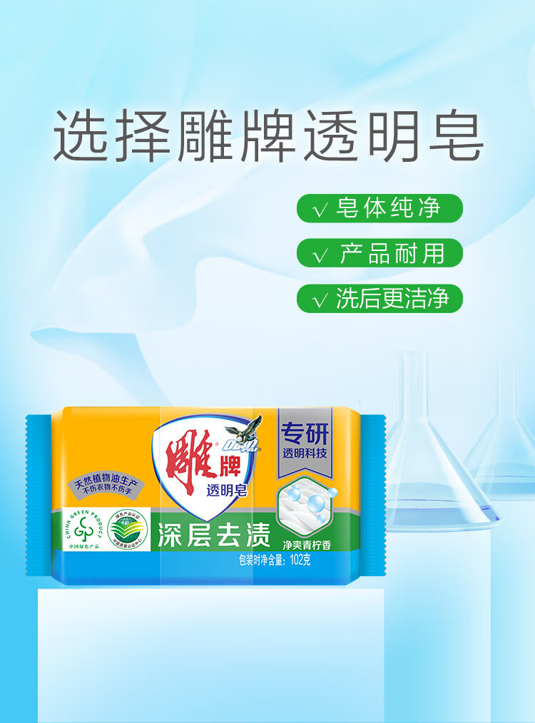 | 产品名称 | 雕牌透明皂洗衣皂块装增白皂深层洁净轻松去污易漂易清大块装肥皂 |