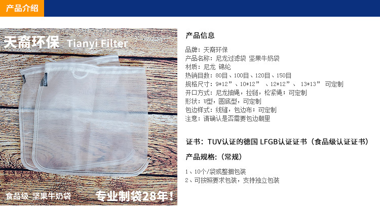 | 产品名称 | 供应食品级尼龙过滤袋 抽绳束口耐高温坚果牛奶豆浆果汁过滤网袋 |